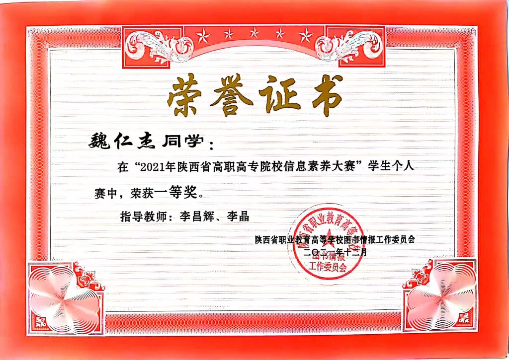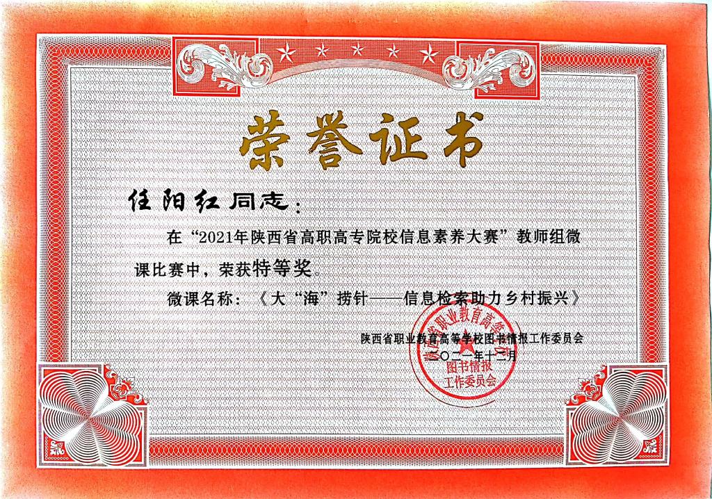 12月18日,2021年省高职高专院校图书馆工作年会暨信息素养大赛总结表彰会宣布了2021年陕西高职高专院校信息素养大赛获奖名单。学校荣获特等奖1项,一等奖2项,二等奖1项,优秀指导教师4名,先进工作者1名,学校荣获“优秀组织奖”。
