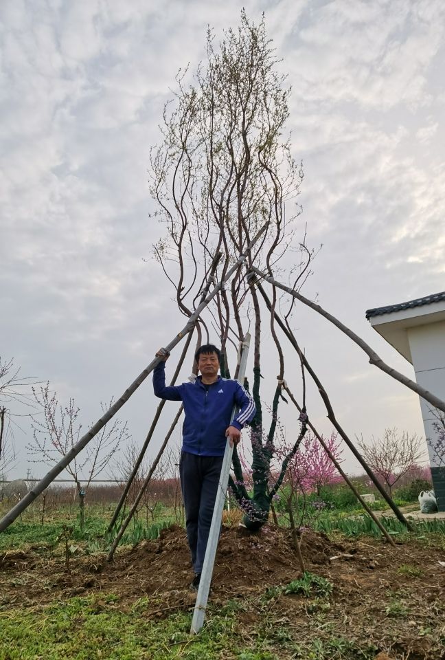 3月13日上午,西北地区桃花专家、杨凌职业技术学院副教授张君超老师在杨凌一处废弃的山桃林中发现了一株山桃珍品——蟠龙山桃。经现场初步测量,其主干地径14.6cm,有9个主枝扭曲向上直立生长,树高约6.5m,冠径1.8m。据了解,这片山桃林树龄已有12年,目前山桃林周边正在建设中。为了保护山桃的珍稀种质资源,3月14日下午,张君超老师将蟠龙山桃迁移至杨凌桃花产学研示范基地,进行迁地保护。