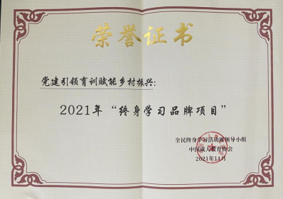 2021年,学校“党建引领‘三进五化’育训赋能乡村振兴”育训模式获评年全省终身学习品牌项目,并推荐为国家级终身学习品牌项目。“培训+”模式服务乡村振兴案例,入选为教育部职业教育助力乡村振兴课题典型案例,并在全国职业教育服务乡村振兴研讨大会上进行了交流。