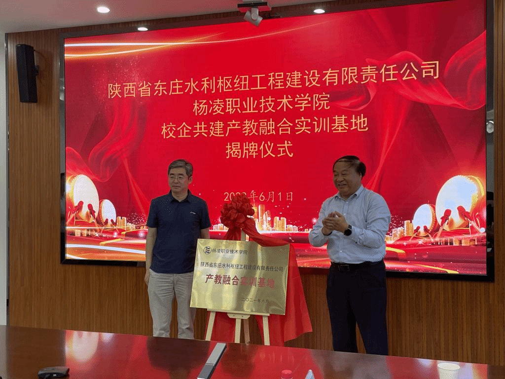 6月1日,学校与陕西省东庄水利枢纽工程建设有限责任公司共建产教融合实训基地仪式在东庄水利枢纽工程建设营地举行。校长王周锁,东庄水利公司党委书记、董事长肖宏武共同为基地揭牌。党委副书记任得元,科技与教育研究处、产教融合处、水利工程学院负责人及其教师代表;东庄水利公司党委副书记、总经理刘晓明,党委副书记李孟来,副总经理刘涛,总工程师杨俊峰,全体中层干部参加了相关活动。