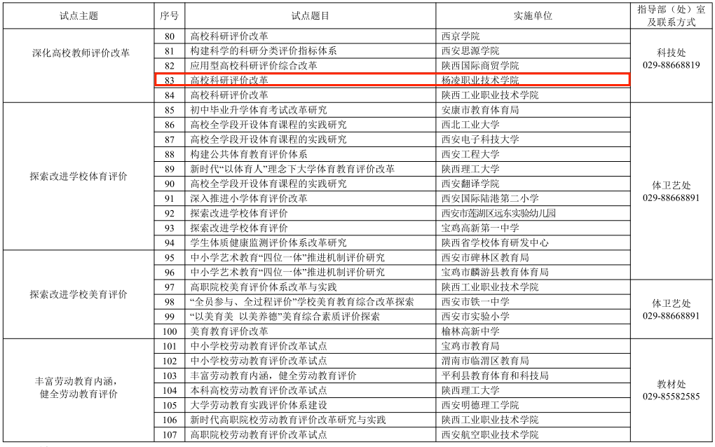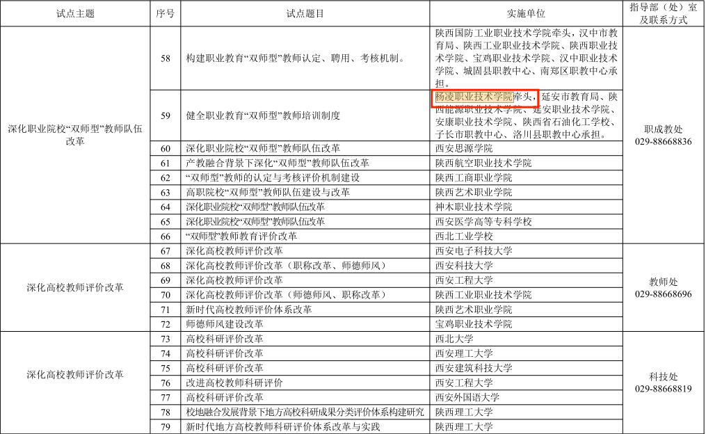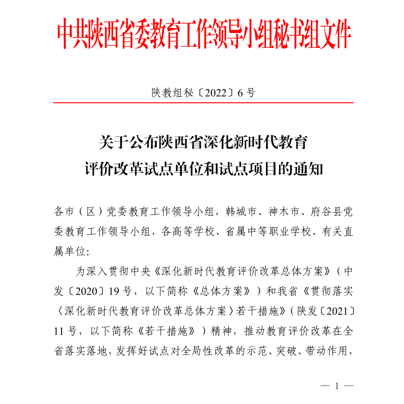近日,省委教育工作领导小组秘书组公布了陕西省深化新时代教育评价改革试点单位和试点项目名单,我校入选综合试点单位并承担“健全职业教育‘双师型’教师培训制度”和“高校科研评价改革”2个试点项目。
