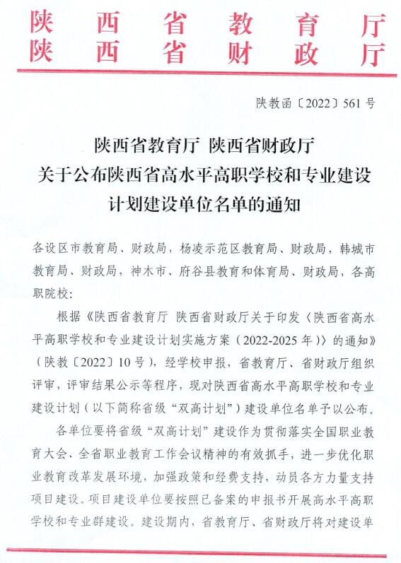 近日,省教育厅、省财政厅公布了陕西省高水平高职学校和专业建设计划建设单位名单,杨凌职院成功入选省级高水平高职学校建设单位(A档),农业生物技术专业群、水利工程专业群、畜牧兽医专业群、园林工程技术专业群、建筑工程技术专业群、计算机应用技术专业群、电子商务专业群7个专业群成功入选省级高水平专业群建设。