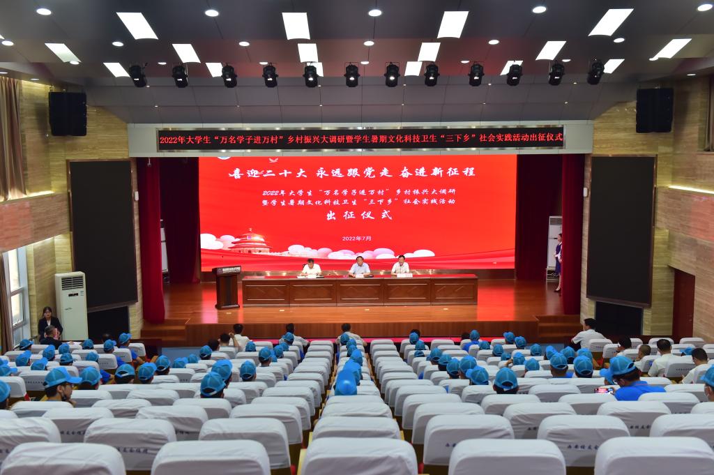 7月6日下午,学校2022年大学生“万名学子进万村”乡村振兴大调研暨暑期“三下乡”社会实践活动启动仪式在南校区思辨堂举行。校长王周锁为社会实践团队授旗,党委副书记任得元主持启动仪式,党委副书记、纪委书记王勇胜作动员讲话。