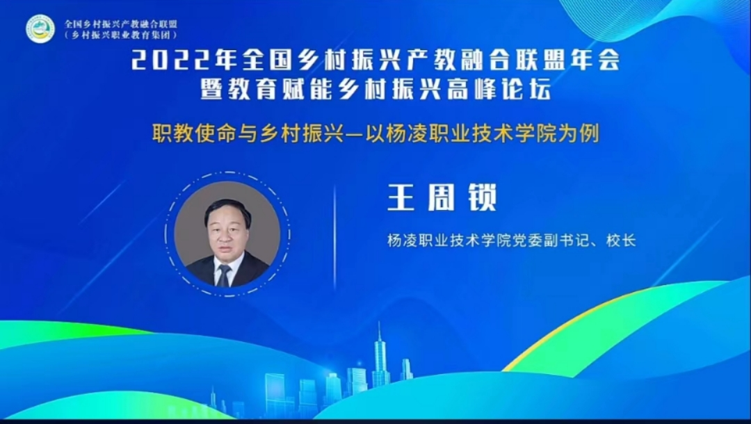8月22日至23日,全国乡村振兴产教融合联盟年会暨教育赋能乡村振兴高峰论坛在北京召开。校长王周锁受邀出席,并通过线上在论坛以《职教使命与乡村振兴——以杨凌职业技术学院为例》为题作专题报告。