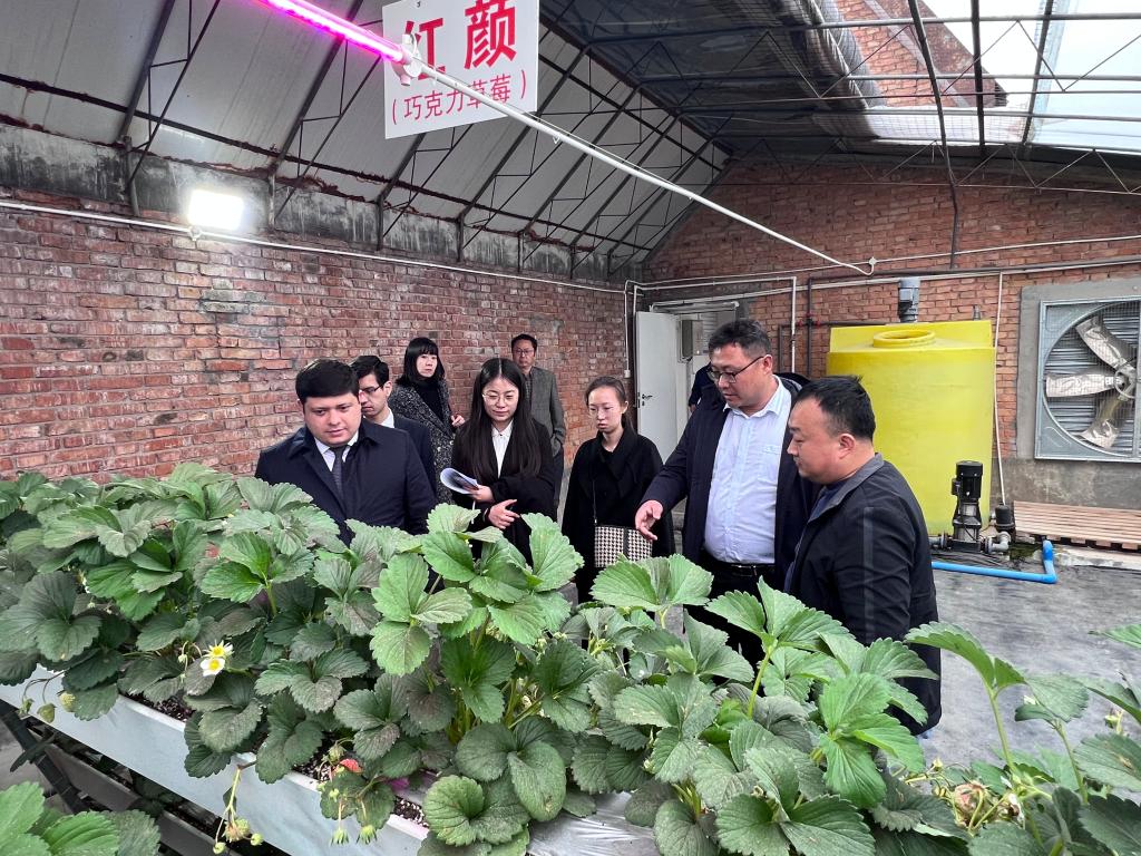 在农林综合实训基地,沙乌马洛夫一行参观了玻璃连栋温室和智慧农业实验温室,听取了我校现代农业专业课程教学实训设施建设、实训课程开设情况的介绍,并就草莓日光温室大棚、西瓜日光温室大棚、鲜食葡萄避雨栽培大棚等,在教学实践中发挥的作用、现代农业科技项目技术推广、涉农专业课程教学等情况与我校教师进行了交流。