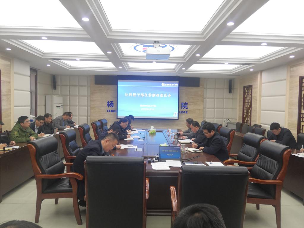 4月6日学校召开处级干部任前廉政谈话会。党委副书记、纪委书记王勇胜出席会议并讲话,党委委员、组织部长田争16位提任处科干部8位岗位调整干部参加会议。会议由纪委副书记晁团光主持