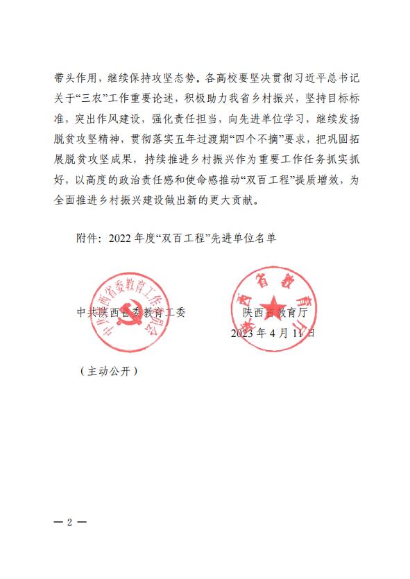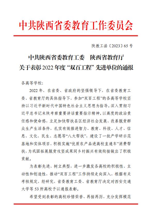 4月11日,省委教育工委、省教育厅公布了2022年度“双百工程”先进单位表彰名单,杨凌职院荣获2022年度“双百工程”工作先进单位荣誉称号,这是学校连续第五年获此荣誉。