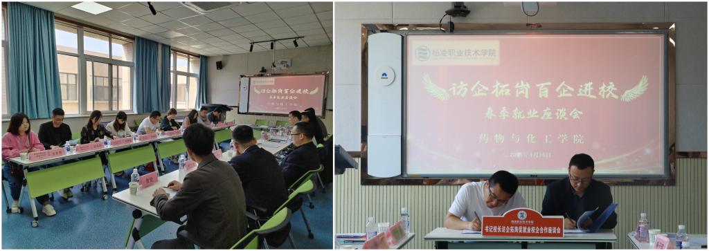 药物与化工学院与陕西东科制药有限责任公司9家企业代表进行座谈,并与陕西量维生物工程有限公司、杨凌金海生物技术有限公司、杨凌萃健生物工程技术有限公司签订校企合作协议。