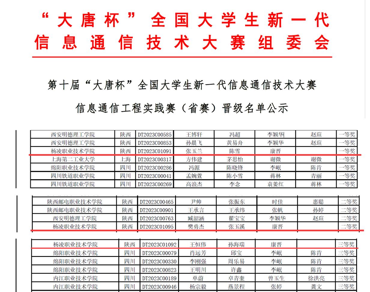 近日,第十届“大唐杯”全国大学生新一代信息通信技术大赛——信息通信工程实践赛道陕西省选拔赛举行。我校现代通信技术专业学生张玉兰、陈雪获省赛一等奖,樊勇杰、张玉溪获省赛二等奖,王恒伟、孙海瑞获省赛三等奖。