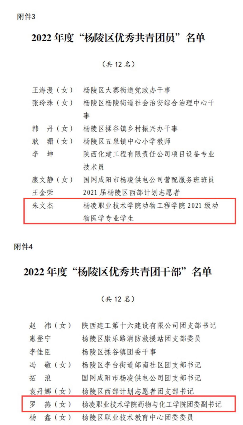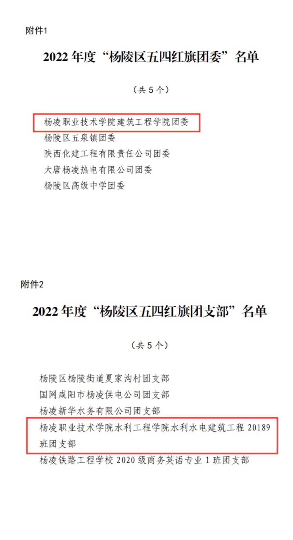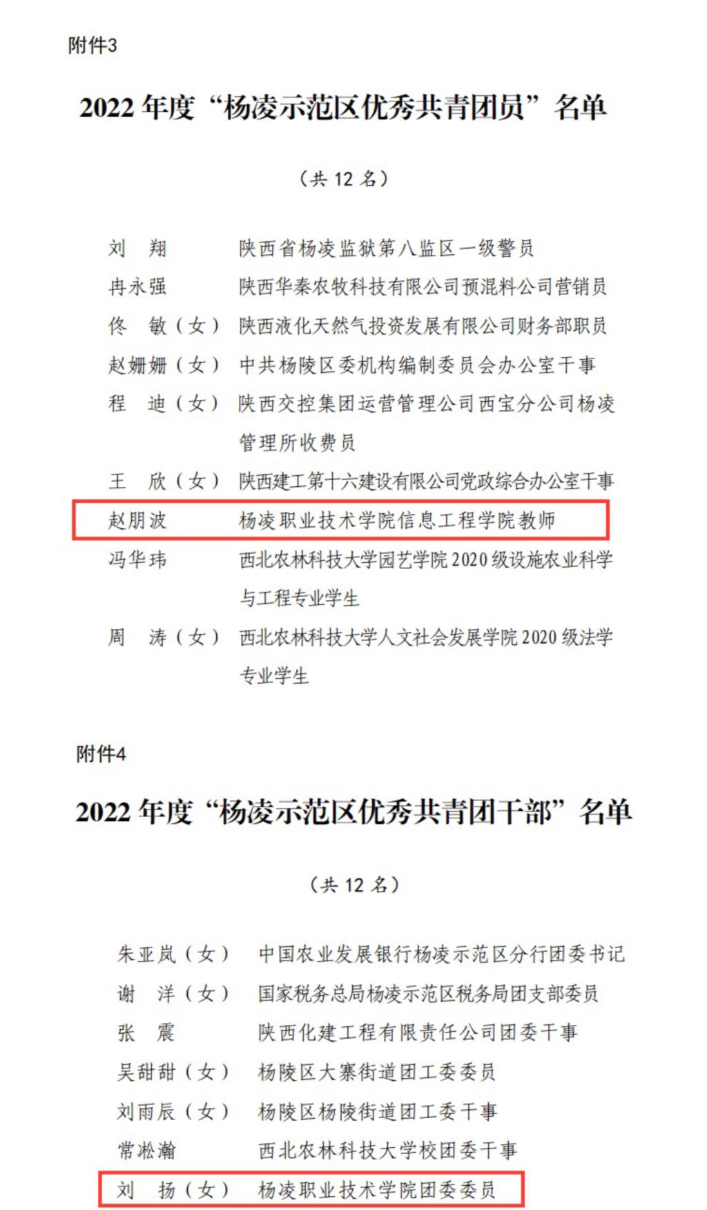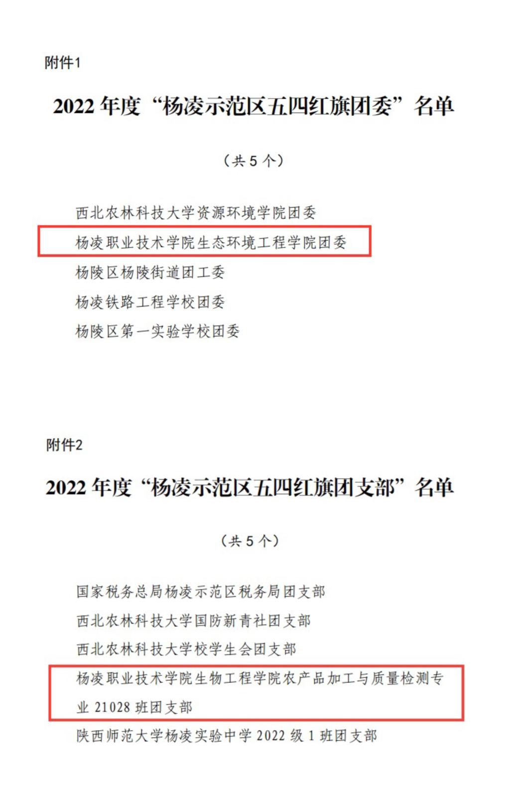 生态环境工程学院分团委获2022年度“杨凌示范区五四红旗团委”,生物工程学院农产品加工与质量检测专业 21028 班团支部获2022年度“杨凌示范区五四红旗团支部”,信息工程学院辅导员赵朋波获2022年度“杨凌示范区优秀共青团员”,校团委刘扬获2022年度“杨凌示范区优秀共青团干部”。建筑工程学院分团委获“杨陵区五四红旗团委”,水利工程学院水利水电建筑工程20189班团支部获“杨陵区五四红旗团支部”,动物工程学院学生朱文杰获“杨陵区优秀共青团员”,药物与化工学院辅导员罗燕获“杨陵区优秀共青团干部”。