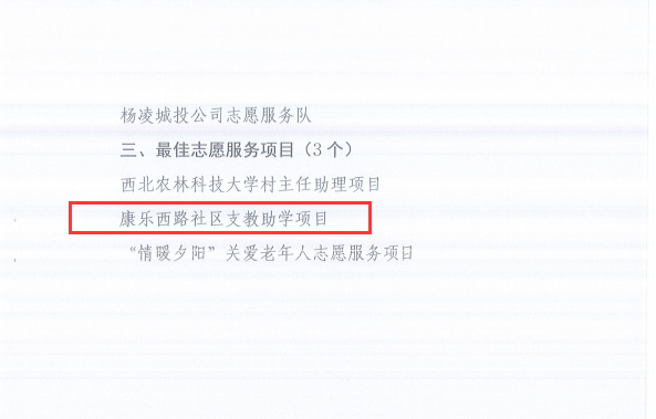 12月4日,杨凌示范区公布了2023年度杨凌示范区学雷锋志愿服务“四个最美(佳)”先进典型名单,我校学生王家乐、教师赵朋波荣获“最美志愿者”称号,信息工程学院青年志愿者协会获“最佳志愿服务组织”称号,生态环境工程学院“康乐西路社区支教助学”项目获得“最佳志愿服务项目”称号。