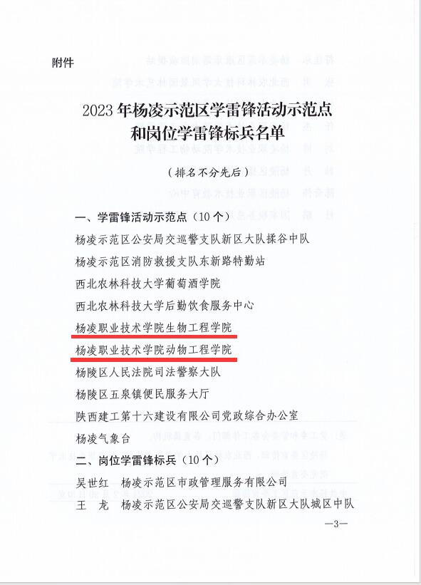 2月20日,杨凌示范区公布了2023年杨凌示范区学雷锋活动示范点和岗位学雷锋标兵名单,学校生物工程学院、动物工程学院获评“学雷锋活动示范点”,教师任杰、刘博荣获“岗位学雷锋标兵”称号。