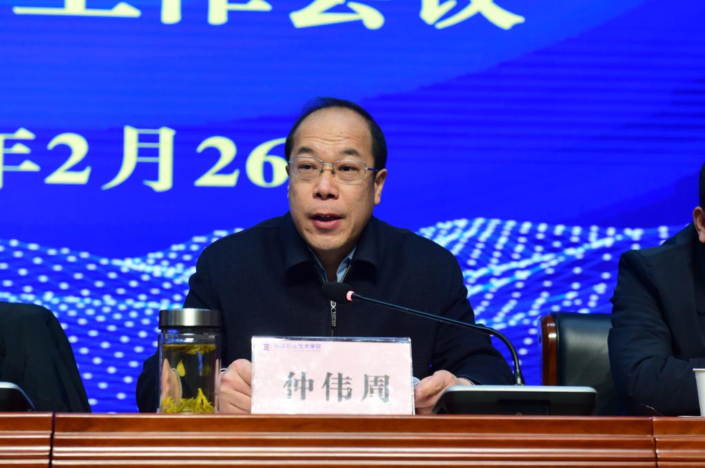 仲伟周从党的建设、三大任务、五育并举、三教改革、师资队伍、科研服务、产教融合、国际合作、办学治校等方面,全面总结了学校2023年各项工作取得的亮眼成绩,科学分析了学校当前面临的机遇与挑战,并对2024年重点工作进行了安排部署。一是全面加强党的领导。要坚持深化理论武装,建强党的基层组织,推进全面从严治党,加强思想宣传引领,创新开展统战群团离退工作,凝聚起全校上下攻坚克难、改革奋进的思想动力和行动合力,为学校发展提供强有力的保障。二是全面深化内涵建设。要构建大育人新架构,深化教育教学改革,深入推进产教融合,提高科技服务能力,打造本科师资团队,提升国际合作品质,强化标志性成果培育,全面提升学校办学水平。三是全面推进“3+1”建设。抓好双高、本科、滨河校区三大建设和“职大嘉苑”家属区等学校发展历史性转折的大事要事,确保双高“优秀”等次通过验收,本科建设顺利通过国省两级高评委专家评估,滨河校区部分设施完成建设并达到投入使用标准。四是全面深化治理改革。要完善学校治理体系,深入开展巡察审计,优化财务资产管理,提升学生管理水平,不断推动学校高质量发展。五是全面强化综合保障。要稳住招生促进优质就业,打造文明智慧健康校园,切实维护校园稳定安全,进一步提升综合服务保障水平。