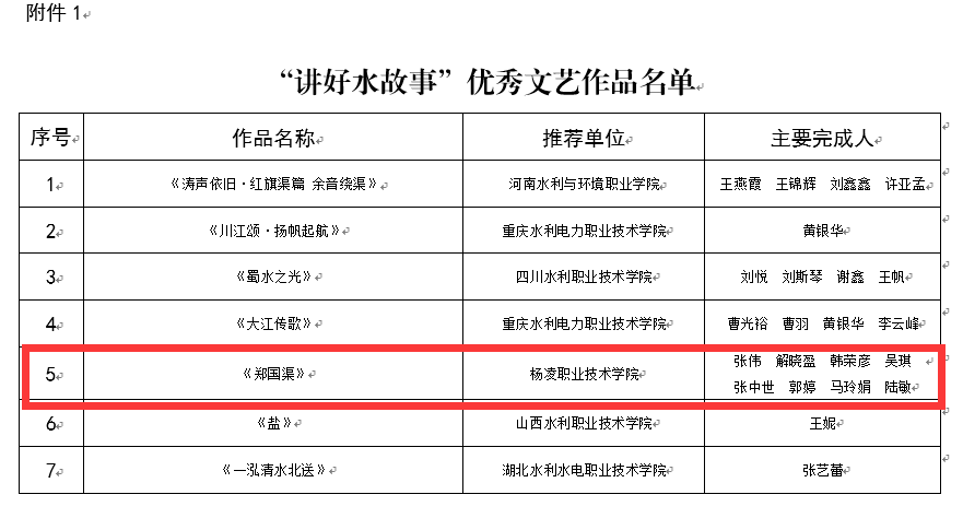 近日,中国水利教育协会公布了第四届水利职业院校水文化育人研讨会相关成果评选结果。由党委宣传部报送的《郑国渠》获“讲好水故事”优秀文艺作品;水利工程学院报送的《以水为基 以师为媒 以文为径——构建水文化思政育人的杨职模式》案例获水文化育人社会实践优秀典型案例。