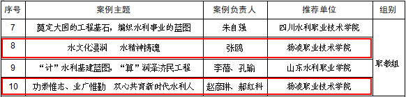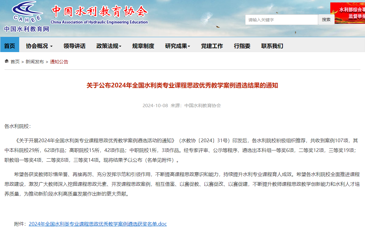 近日,中国水利教育协会公布了2024年全国水利类专业课程思政优秀教学案例遴选结果。水利工程学院教师张鸥报送的《水文化浸润 水精神铸魂》案例、赵彦琳和郝红科报送的《功崇惟志、业广惟勤 双心共育新时代水利人》案例均获职教组一等奖;马己安、张春娟报送的《“溃坝”的启示——平面静水压力计算》案例获职教组三等奖。9月19日,张鸥受邀参加了中国水利教育协会举办的第三届水利德育教育研讨会,并就获奖案例进行了课程思政优秀案例主题分享与交流。