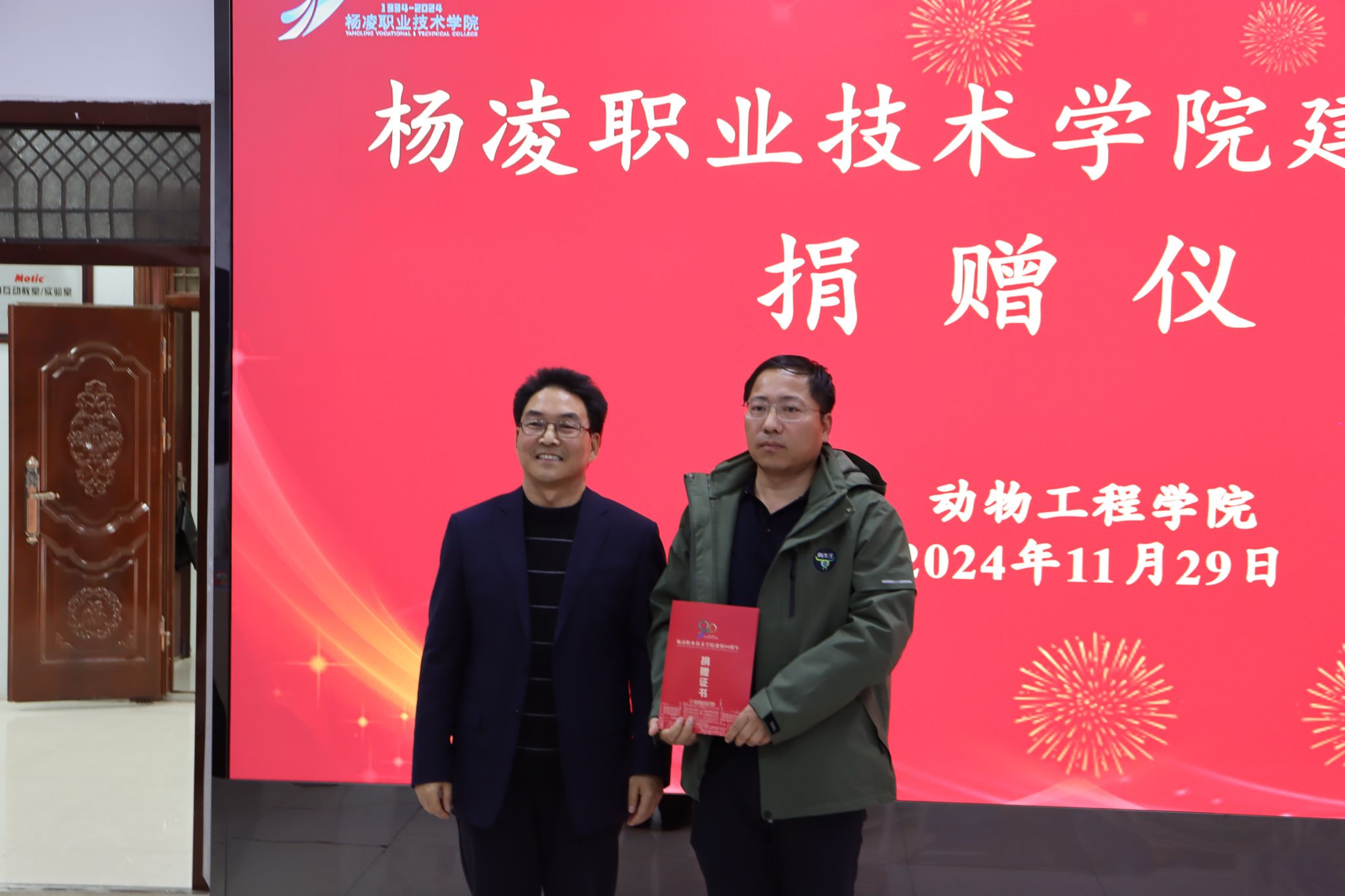 北京大北农科技集团股份有限公司、陕西石羊农业科技股份有限公司、内蒙古圣牧高科牧业有限公司、凉城县海高牧业养殖有限责任公司、新希望六和股份有限公司、西安京和动物医院有限公司和陕西兽小宠生物科技有限公司等企业分别向学校捐赠现金和物资,希望与学校深化合作。宠物行业校友联盟、1984级养蜂专业303班和1997级畜牧兽医431班分别捐赠现金、画册等。