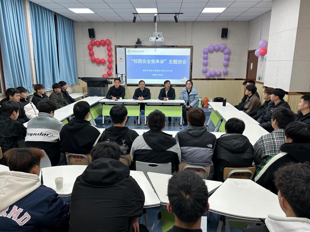 11月26日,交通与测绘工程学院围绕学生校园安全开展集中宣传学习,副校长张朝晖深入学生班级参加主题班会,鼓励学生将所学所感应用到日常学习生活中,形成“人人讲安全,事事为安全,时时想安全,处处要安全”的良好风尚。班主任和班级学生共同组建了安全宣讲团队,发挥学生自我教育、自我管理、自我服务、自我监督的作用,引导广大学生树立安全意识,共同守护平安校园建设。