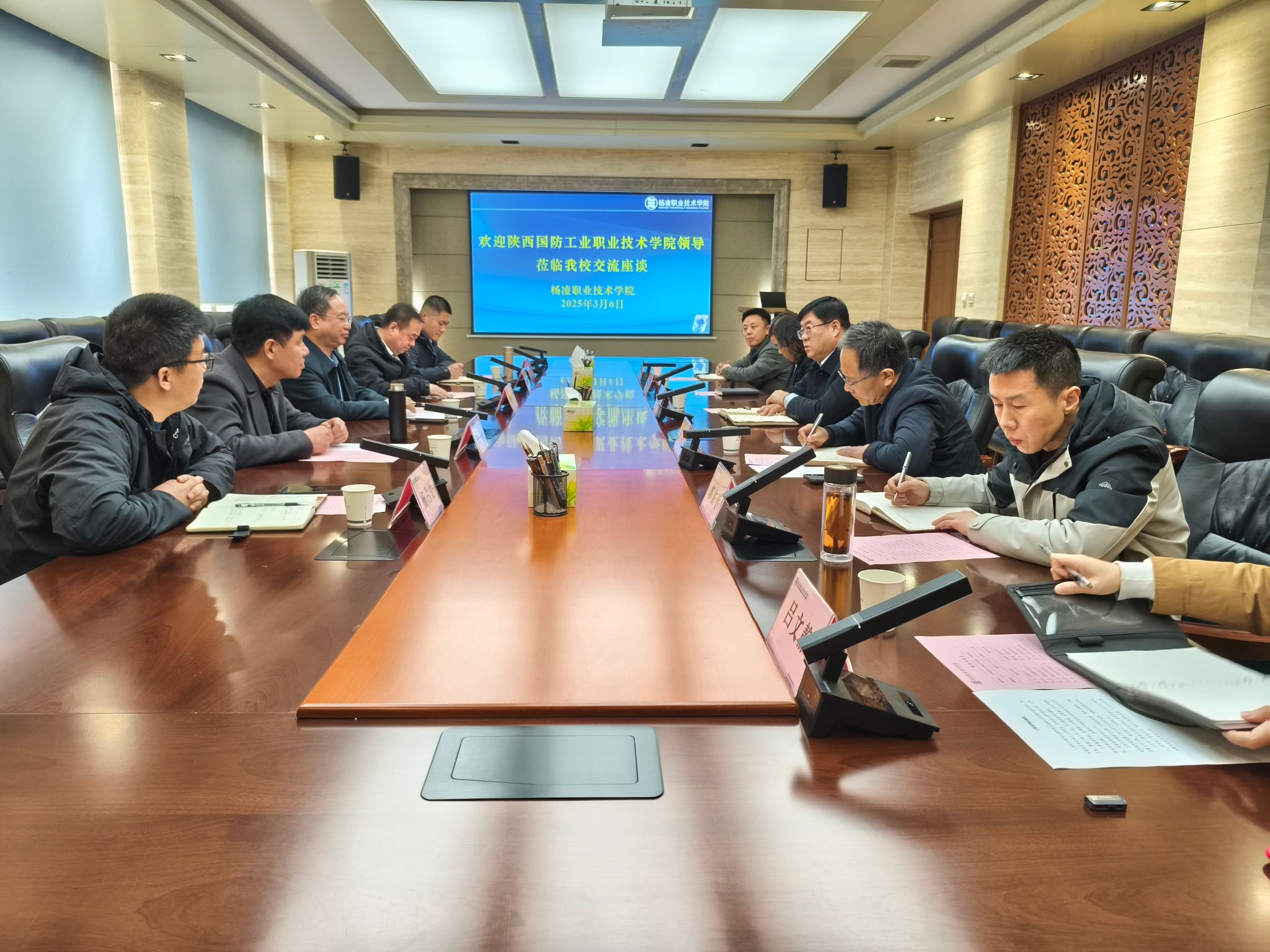 3月6日,陕西国防工业职业技术学院党委副书记杨聪一行5人来校调研滨河校区建设情况。党委副书记刘瑞明参加座谈。