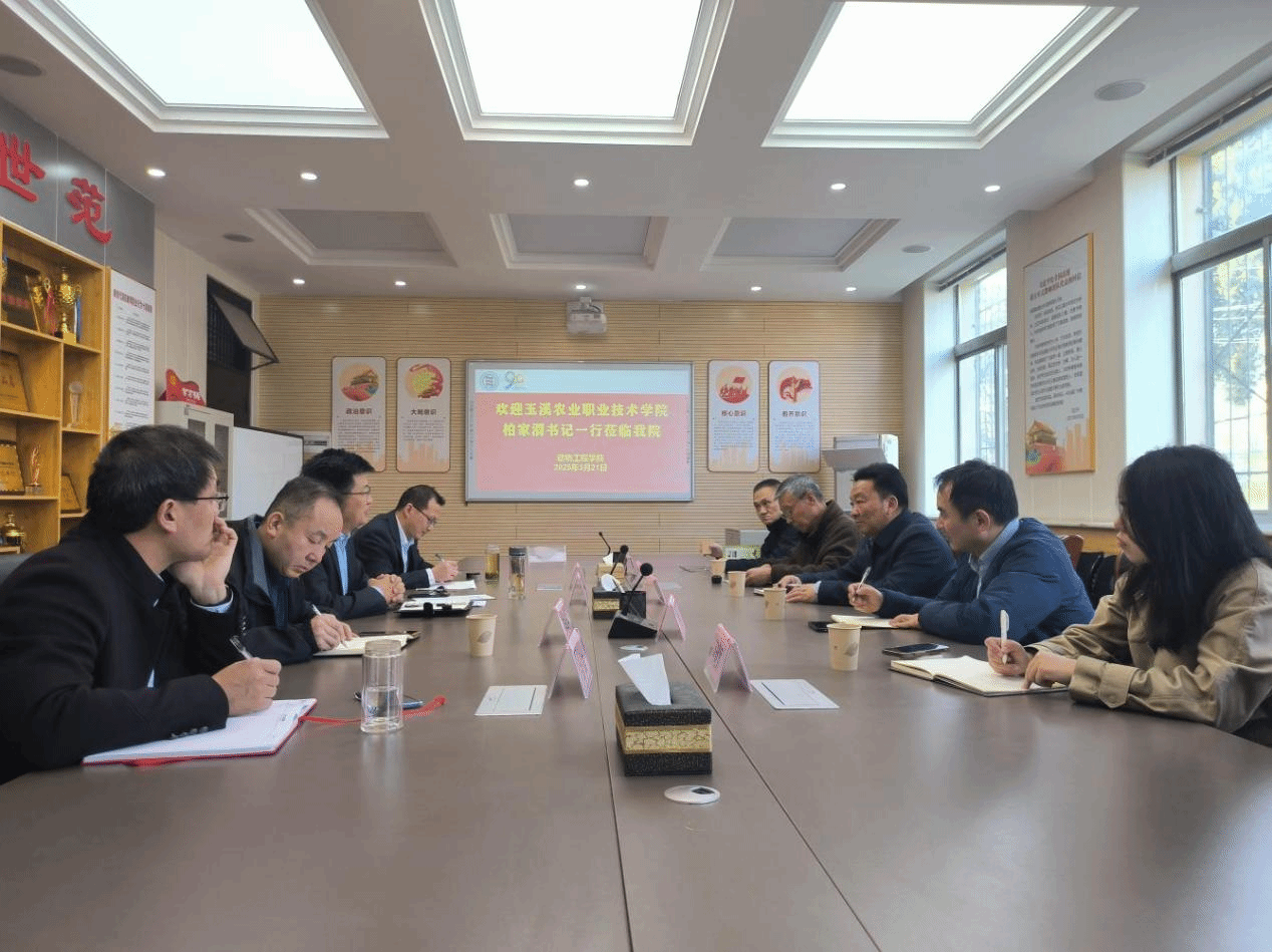3月21日下午,玉溪农业职业技术学院党委书记柏家渭副院长张军云一行来校考察交流。玉溪市教育体育局人事科副科长姜荣恒,玉溪农业职业技术学院银龄教师、陕西省畜牧业协会宠物产业分会会长周庆国,玉溪农业职业技术学院人事科科长何晓颖共同考察。我校动物工程学院负责人和教师代表等陪同考察