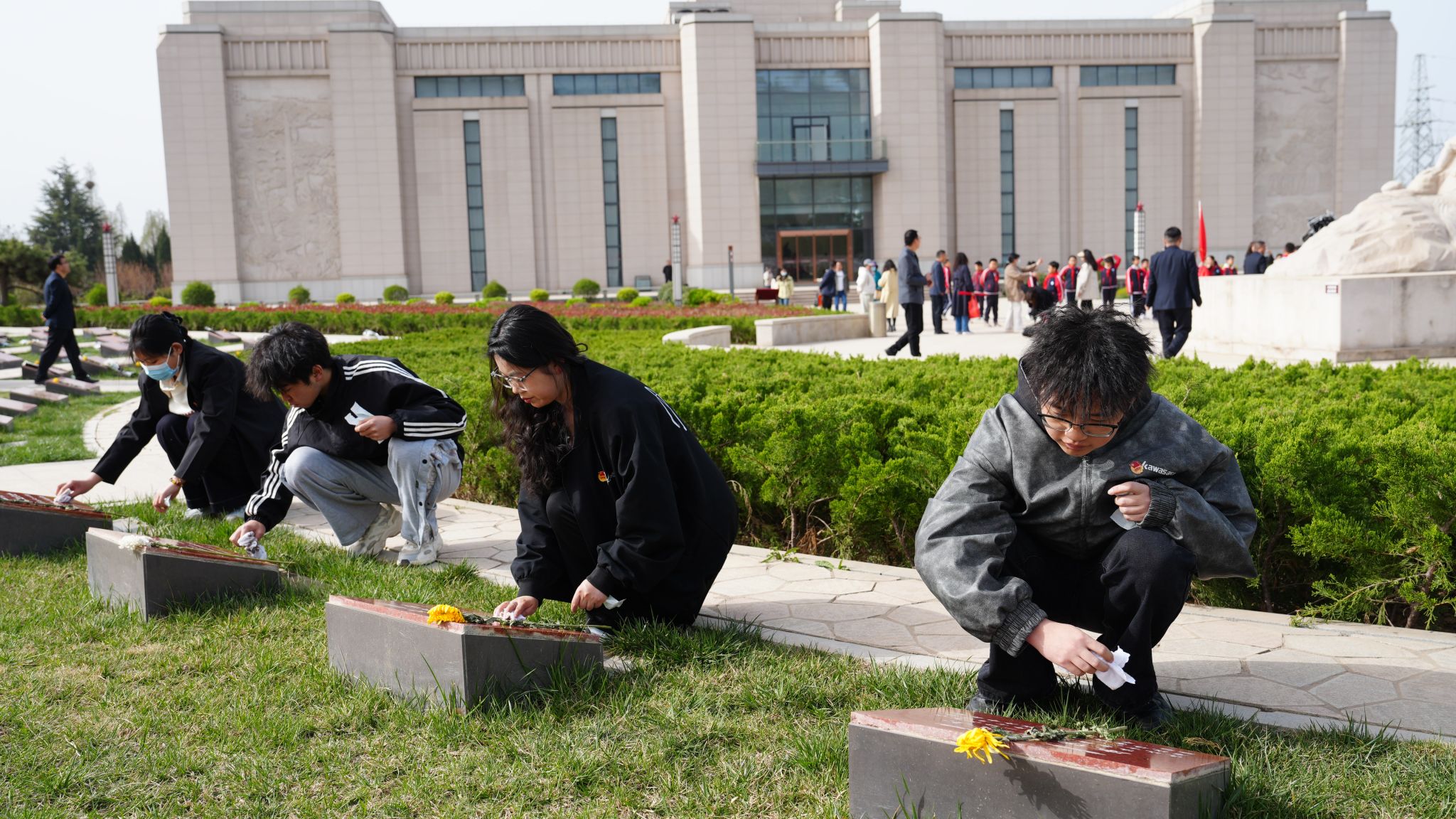 学生为烈士擦拭墓碑