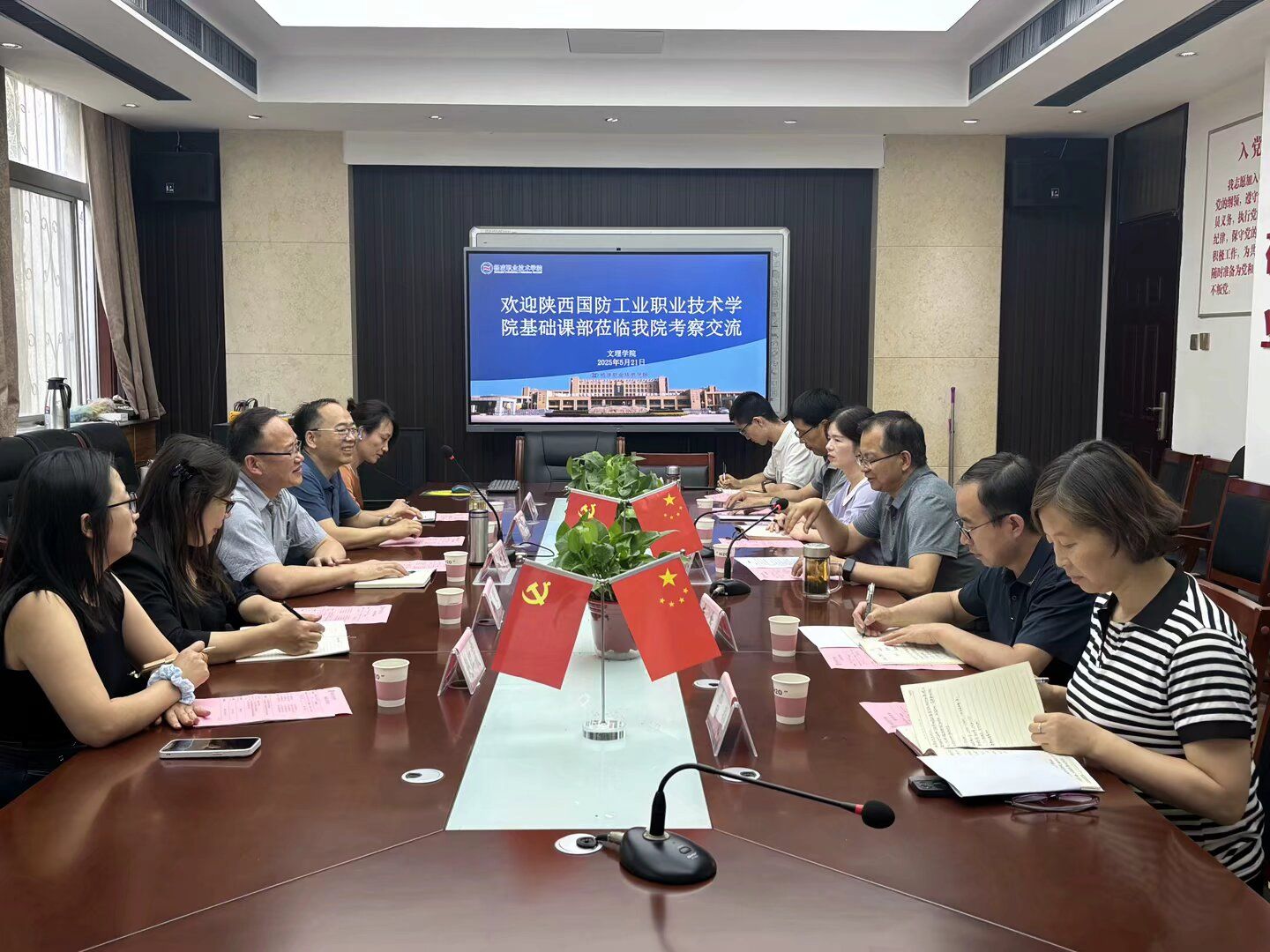 5月21日下午,陕西国防工业职业技术学院基础课部主任杨文革一行来校考察交流。文理学院负责人、办公室副主任及相关教师陪同考察并座谈。