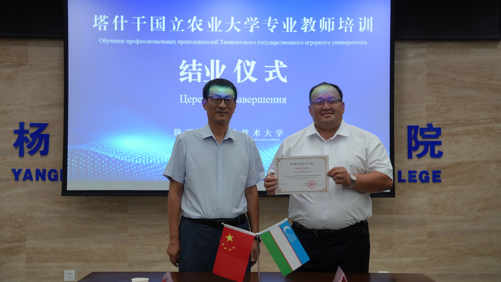 7月4日,乌兹别克斯坦塔什干国立农业大学14名教师代表在我校圆满完成现代农业技术培训。副校长蒋平江为参训教师颁发结业证书。