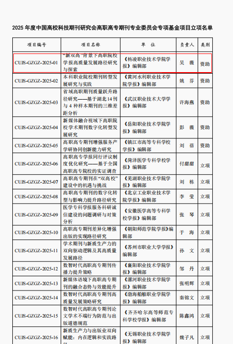 9月29日,中国高校科技期刊研究会先后公布了2025年度专项基金项目立项评审结果和首届高职高专期刊高影响力论文案例库征集评选结果。我校学报编辑部吴薇副研究员主持申报的《“新双高”背景下高职院校学报高质量发展路径研究与探索》课题,经多轮筛选,从76项申报项目中脱颖而出,获批高职高专期刊专项基金资助项目。由牛永浩等人撰写的《昆虫信息素在松墨天牛防治中的应用研究》一文,刊载于2024年第3期《杨凌职业技术学院学报》,从全国参选的81篇论文中脱颖而出,成功入选首届高职高专期刊高影响力论文案例库。