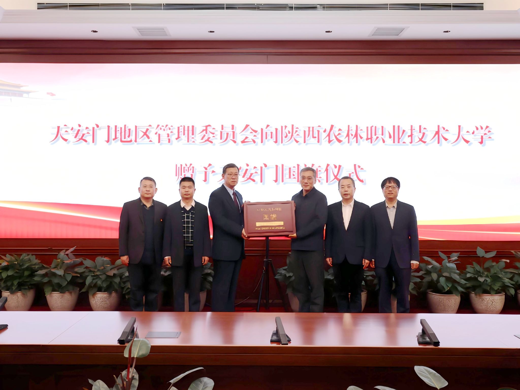 10月31日,北京市人民政府天安门地区管理委员会在天安门地区运行调度中心向陕西农林职业技术大学赠送天安门国旗。天安门地区管理委员会党组成员、副主任姚辉(正局级)向学校赠送国旗,党委书记韩明军代表学校接收国旗,签订了《国旗赠予协议》。学校副校长胡俊鹏、招生就业处、党政办相关同志参加赠旗仪式。