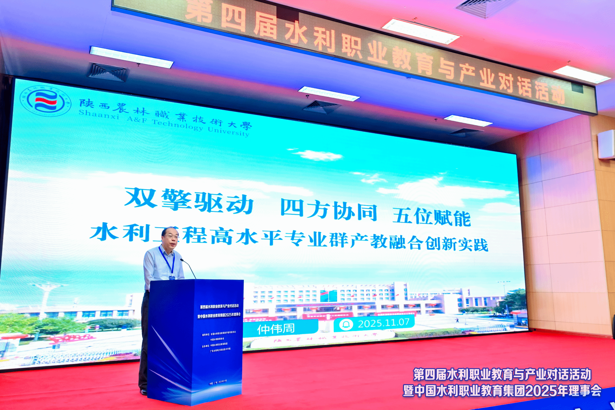 11月7日,由全国水利职业教育教学指导委员会和中国水利教育协会指导,中国水利职业教育集团和广东水利电力职业技术学院主办的第四届水利职业教育与产业对话活动在广东水利电力职业技术学院举行。我校校长仲伟周受邀参加活动,并以《双擎驱动、四方协同、五位赋能:水利工程高水平专业群产教融合创新实践》为题作主题报告。