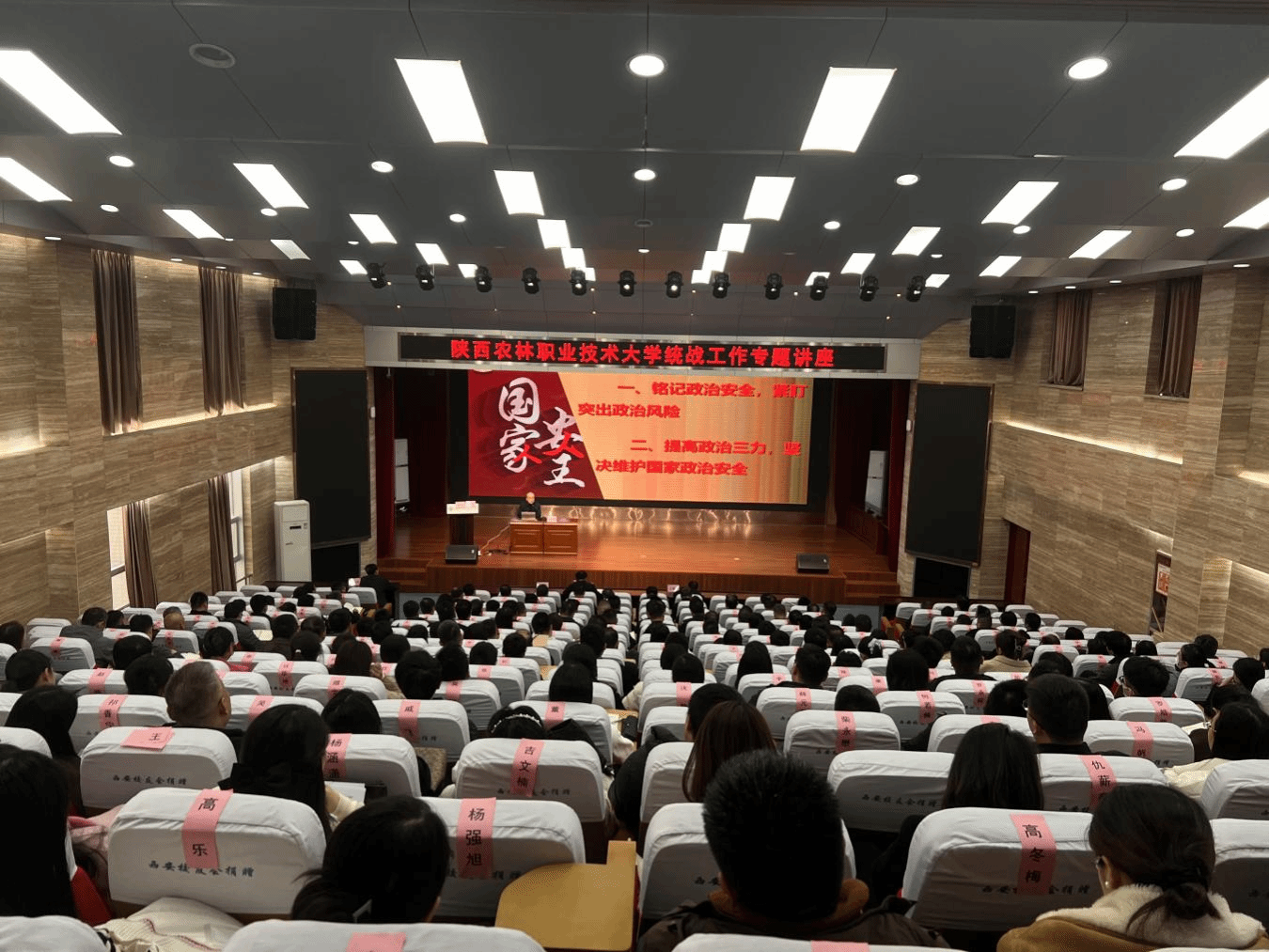 12月4日,学校举办统战工作专题讲座,原西安市公安局警察训练支队教官、二级调研员、三级警监高振国以《防范化解政治风险 坚决维护国家政治安全》为题作报告。党委副书记刘瑞明、王勇胜,全体处科级干部、党支部书记,各学院辅导员、班主任共计200余人聆听报告。