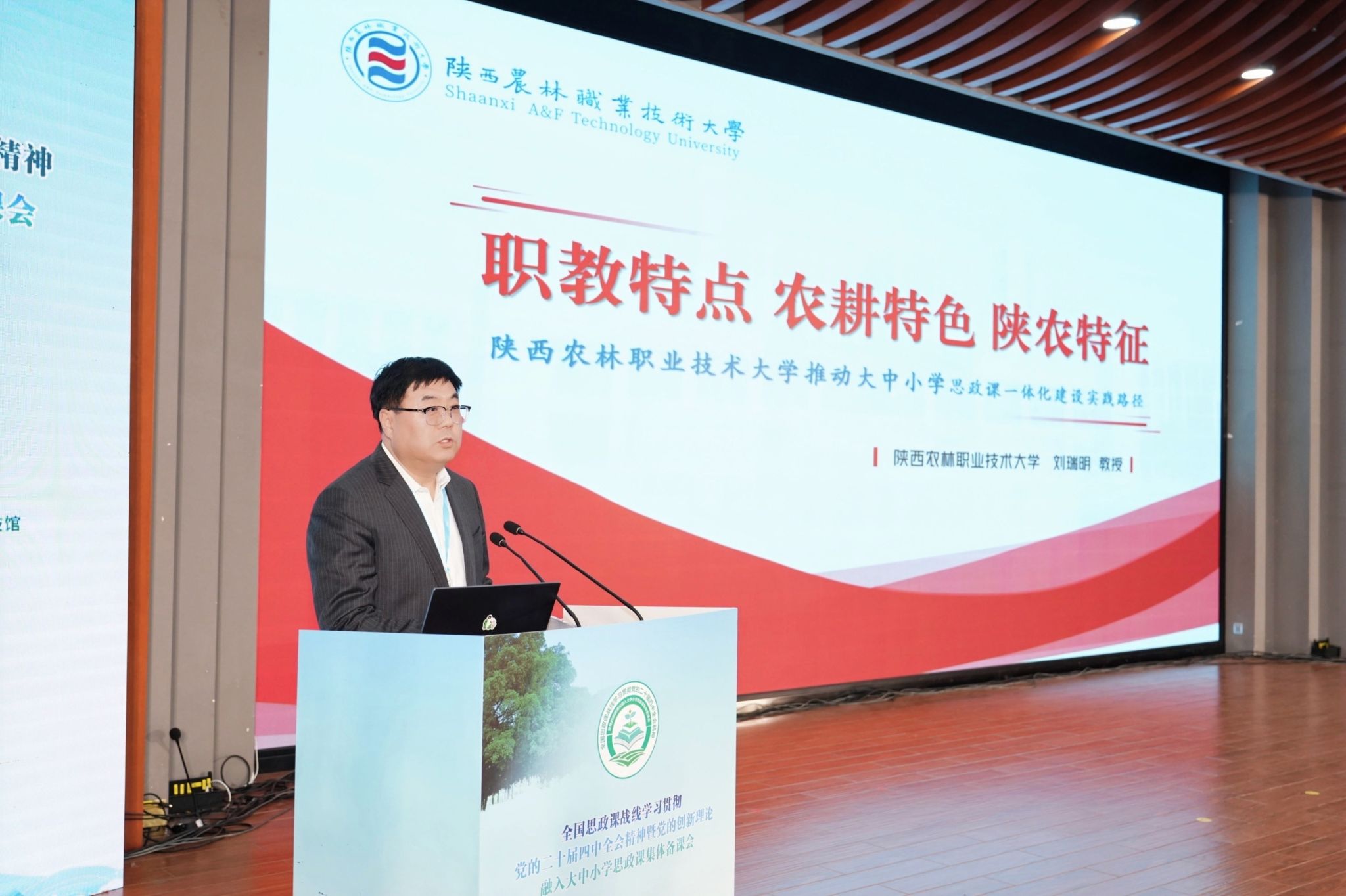 刘瑞明以《职教特点 农耕特色 陕农特征——陕西农林职业技术大学推动大中小学思政课一体化建设实践路径》为题,介绍了学校立足职业教育类型特征和农耕文化特色、探索大中小学思政课一体化创新路径的思路,并从注重协同联动,牵头组建一体贯通两大平台;挖掘各类资源,打造“一址三馆”思政教育阵地;突出涉农特色,全面实施“后稷正禾育人”工程;丰富教学内涵,打造优质思政教学资源;强化各项保障,不断提升思政队伍能力水平等五个方面介绍了学校的主要做法,分享了学校在推动大中小学思政课一体化建设方面取得的经验与成效,并就进一步深化大中小学思政课一体化改革、培养更多强农报国高端技能人才提出建议思考,受到了与会领导、专家及兄弟院校代表的高度认可与广泛好评。
