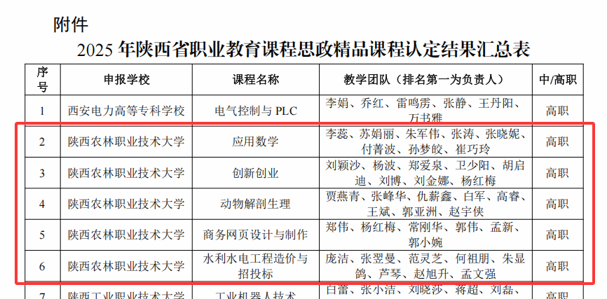 近日,省教育厅公布了2025年陕西省职业教育课程思政精品项目认定结果。我校李蕊教师团队负责的《应用数学》、刘颖沙教师团队负责的《创新创业》、贾燕青教师团队负责的《动物解剖生理》、郑伟教师团队负责的《商务网页设计与制作》和庞洁教师团队负责的《水利水电工程造价与招投标》5门课程被认定为省级课程思政精品课程,教学团队荣获省级课程思政教学团队称号。