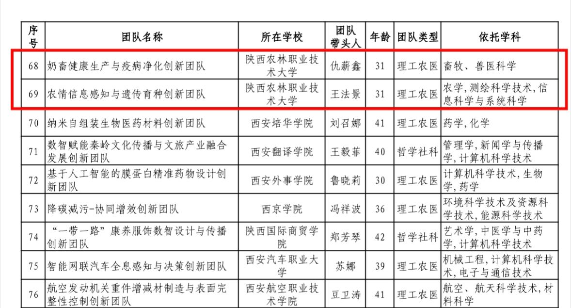 近日,省教育厅公布了2025年度陕西高校青年创新团队入选名单,由我校教师仇薪鑫牵头的奶畜健康生产与疫病净化创新团队、王法景牵头的农情信息感知与遗传育种创新团队成功入选。截至目前,学校省级青年创新团队达 5 个,标志着青年科研梯队建设再获重要突破。