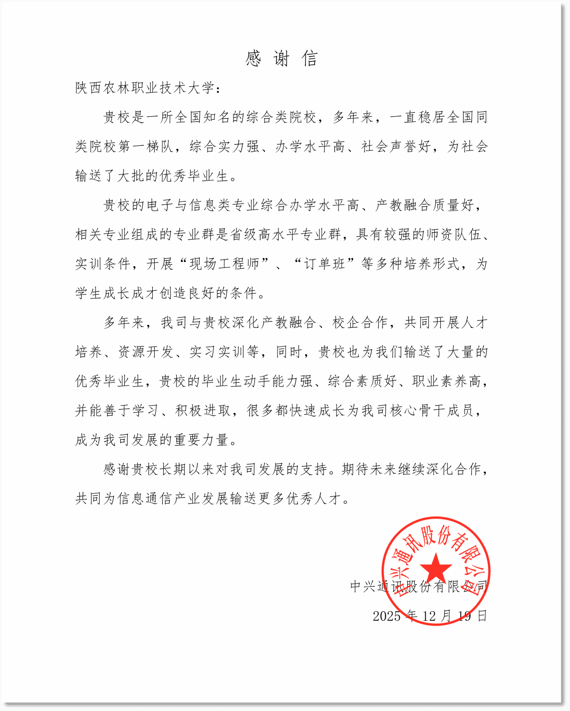 近日,中兴通讯股份有限公司向我校发来感谢信,对我校办学实力、人才培养质量及双方长期合作的成效给予高度肯定。