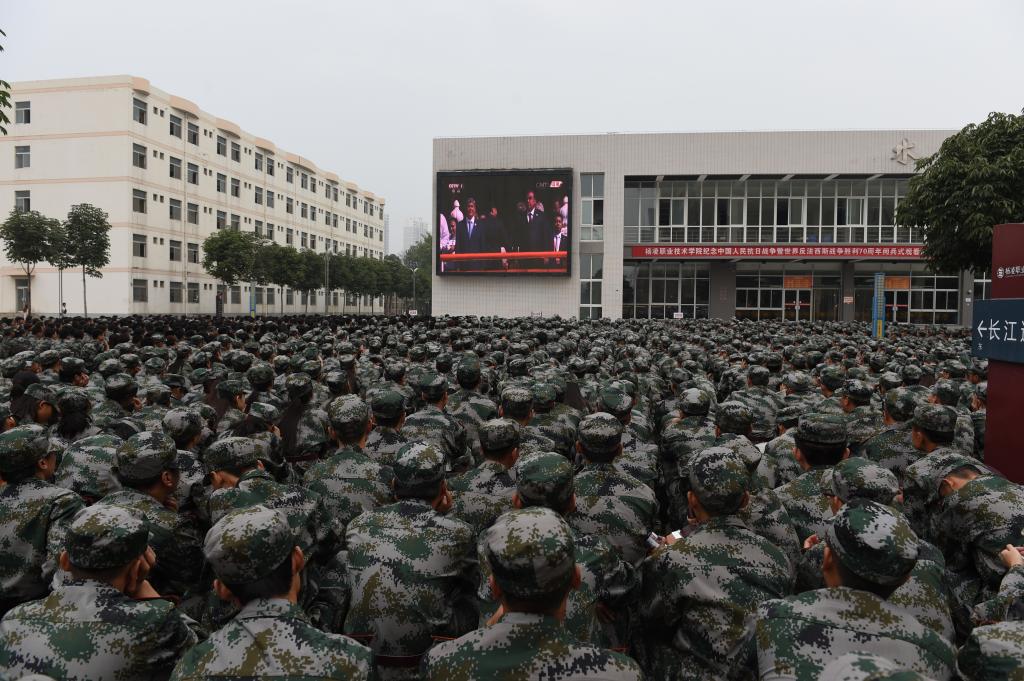 按照院党委的部署,学院领导、各部门负责同志以及6000余名新生分别在南校区水善厅前、西校区餐厅、学生大礼堂、学生餐厅、致用楼台阶教室等场所集中收看了这一盛典实况,共同庆祝这一激动人心的神圣时刻。也有很多师生员工通过电视、网络等各类媒体自行收看了阅兵式和纪念大会现场直播。陕西电视台对我院组织师生收看阅兵式进行了采访。