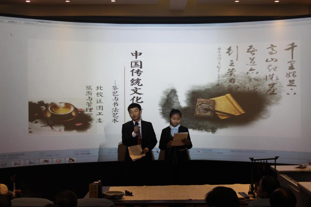 1123日晚,由学院北校区团工委主办、旅游与管理分院团总支承办的“中国传统文化讲座——茶艺与书法艺术”在北校区3D模拟导游实训室开讲。讲座由中国书法家协会会员、我院书画艺术中心主任李德君老师及国家高级茶艺师、旅游与管理分院教师王晓娟老师主讲,旅游与管理学院学生、北校区书画爱好者共计100余人参加了讲座。院团委书记、旅游与管理分院负责人等应邀参加了本次活动。