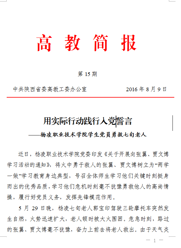 89日,陕西省委高教工委《高教简报》第15期以“用实际行动践行入党誓言——杨凌职业技术学院学生党员勇救七旬老人”为题,宣传报道了我院学生党员张翼、贾文博火海救人的先进事迹。文中指出,张翼、贾文博是高校系统“两学一做”学习教育中涌现出来的先进典型,号召高校广大师生党员以他们为榜样,牢记党员身份,实实在在地向标杆和先进学习,用自身行动彰显党性修养。