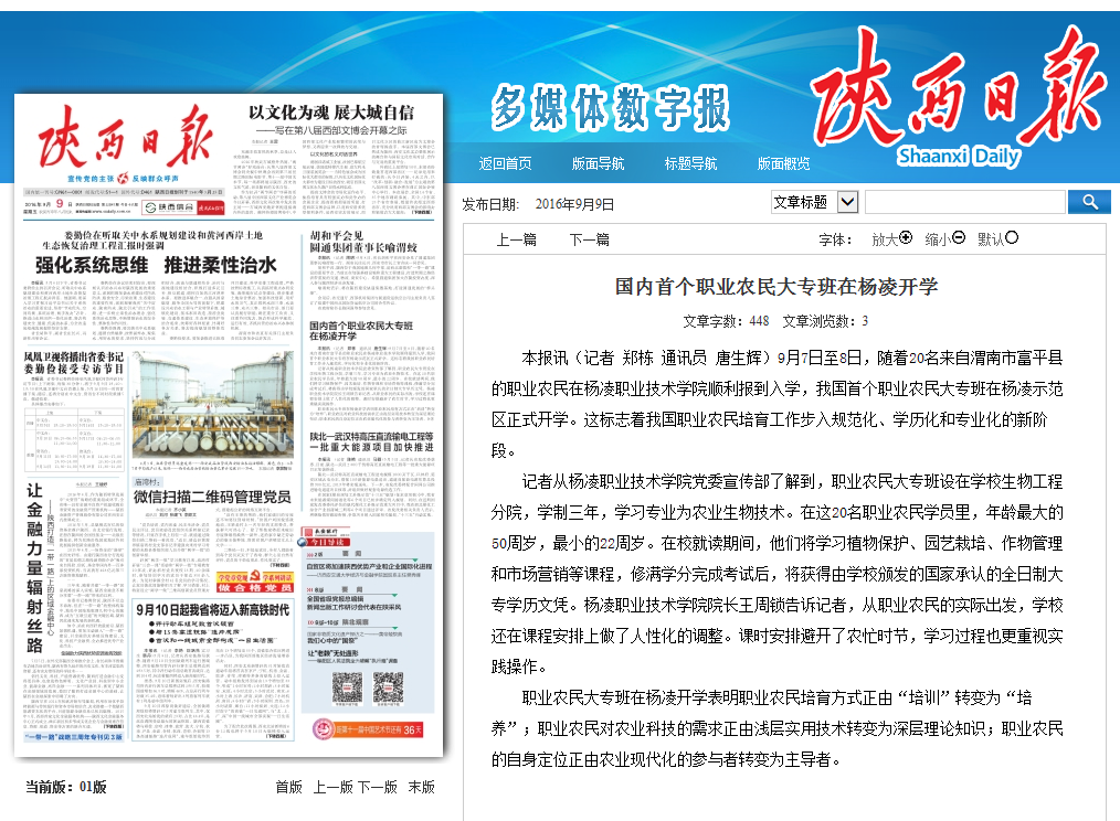【陕西日报】头版:国内首个职业农民大专班在杨凌开学