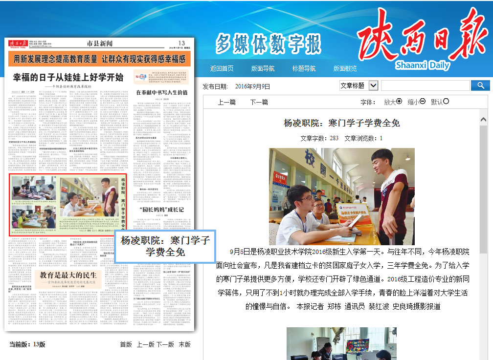 99日,陕西日报头版,报道了我院职业农民大专班开学情况(详情进入)。第十三版,以图片新闻形式报道了我院对建档立卡贫团生免学费情况(详情进入)