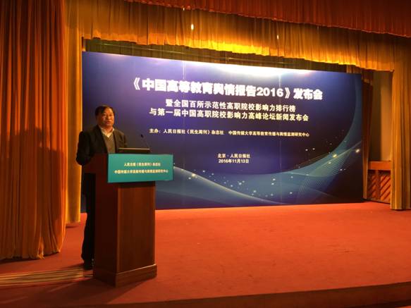 1113日上午,“2016中国高等教育舆情报告发布会暨全国百所示范性高职院校影响力排行榜与第一届中国高职院校影响力高峰论坛新闻发布会”在人民日报社举行,我院院长王周锁应邀参加了本次新闻发布会。