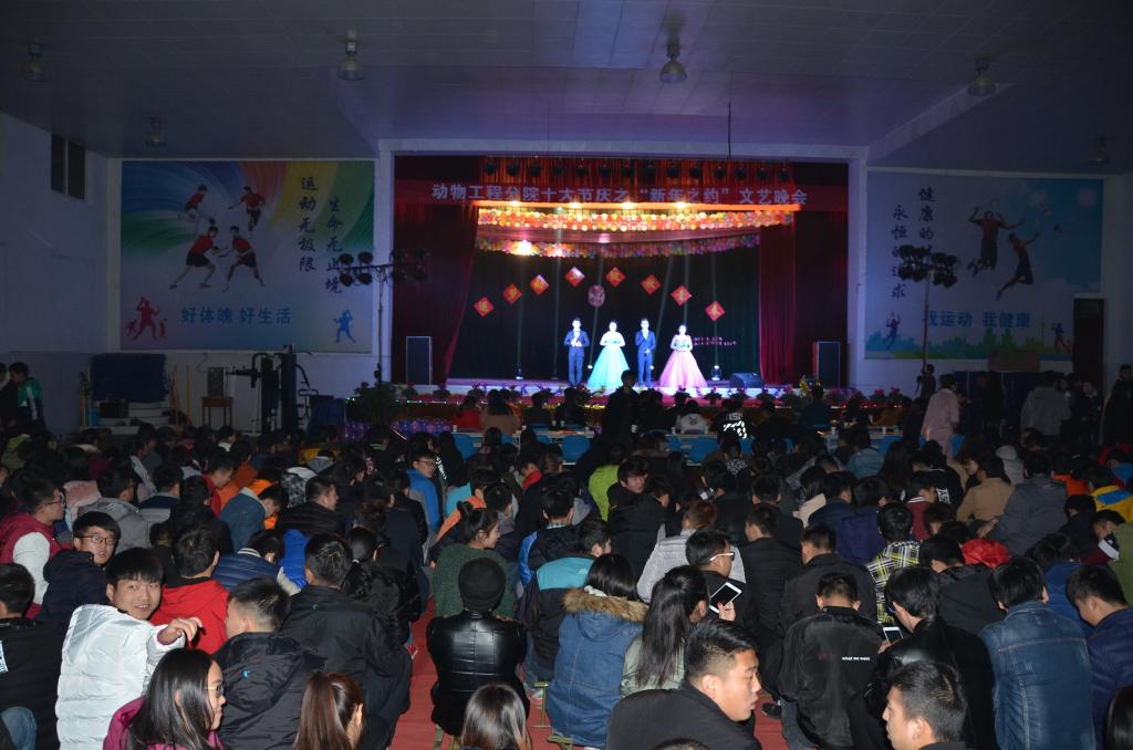 12月26日晚,西校区大礼堂炫光闪耀、歌声飞扬,动物工程分院十大节庆主题教育活动之“新年之约”文艺晚会在此隆重举行。学生处、动物工程分院负责人,陕西康达尔农牧科技有限公司销售总监闫树林、销售经理刘坤,分院辅导员、班主任、学生1200余人观看了晚会。热情奔放的陕北腰鼓《开门红》拉开了晚会的帷幕;小品《迎新生》讲述了校园生活乐趣,幽默诙谐、令人捧腹;舞蹈《红军不怕远征难》诠释了红军克服千难万阻完成了二万五千里长征的伟大壮举,献礼纪念红军长征胜利80周年;街舞《篮球宝贝》激情四射,张扬青春活力;配乐诗朗诵《致青春》高亢激昂、饱含深情;二胡独唱《莫尼山》悠扬委婉,将晚会推向了高潮;集双节棍、剑术、跆拳道等为一体的武术表演《武林风》落下了晚会的帷幕。