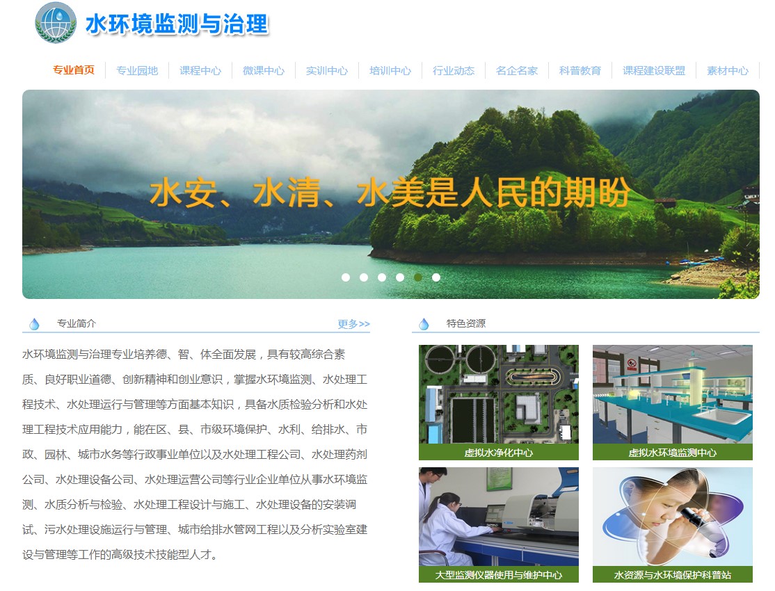 水环境监测与治理专业教学资源库由我院与南通科技职业学院、重庆水利电力职业技术学院共同主持,联合21所高职院校、3所本科院校和24家行业企业、1家出版社、4家行业协会共同建设。联建单位覆盖全国17个省(区、市),集中了国内水环境监测与治理领域一流企业与示范院校力量,汇聚了国内外一流资源,在国家级专业教学资源库备选项目申报中,以排名第2位次被陕西省推荐参评;在教育部评议过程中,最终以总排名第8位获得国家立项。