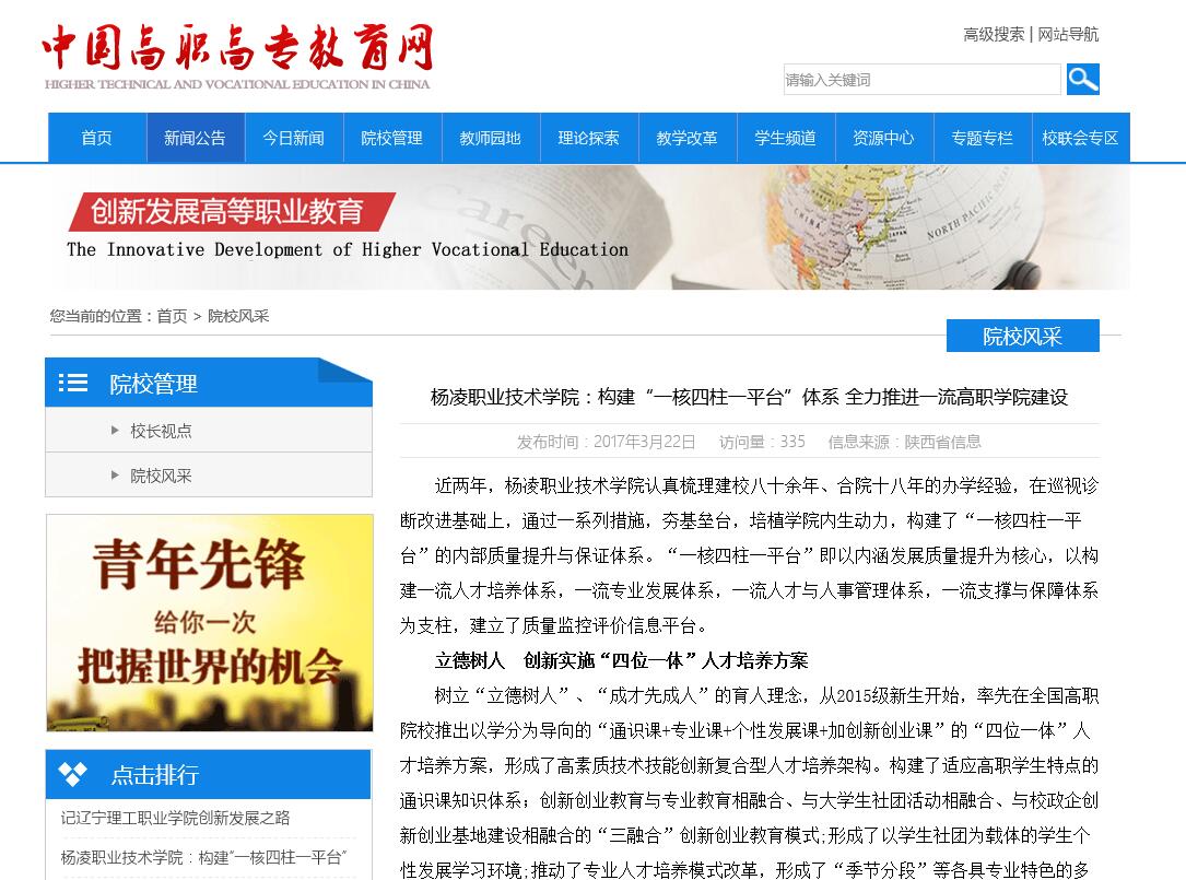 近两年,杨凌职业技术学院认真梳理建校八十余年、合院十八年的办学经验,在巡视诊断改进基础上,通过一系列措施,夯基垒台,培植学院内生动力,构建了“一核四柱一平台”的内部质量提升与保证体系。“一核四柱一平台”即以内涵发展质量提升为核心,以构建一流人才培养体系,一流专业发展体系,一流人才与人事管理体系,一流支撑与保障体系为支柱,建立了质量监控评价信息平台。