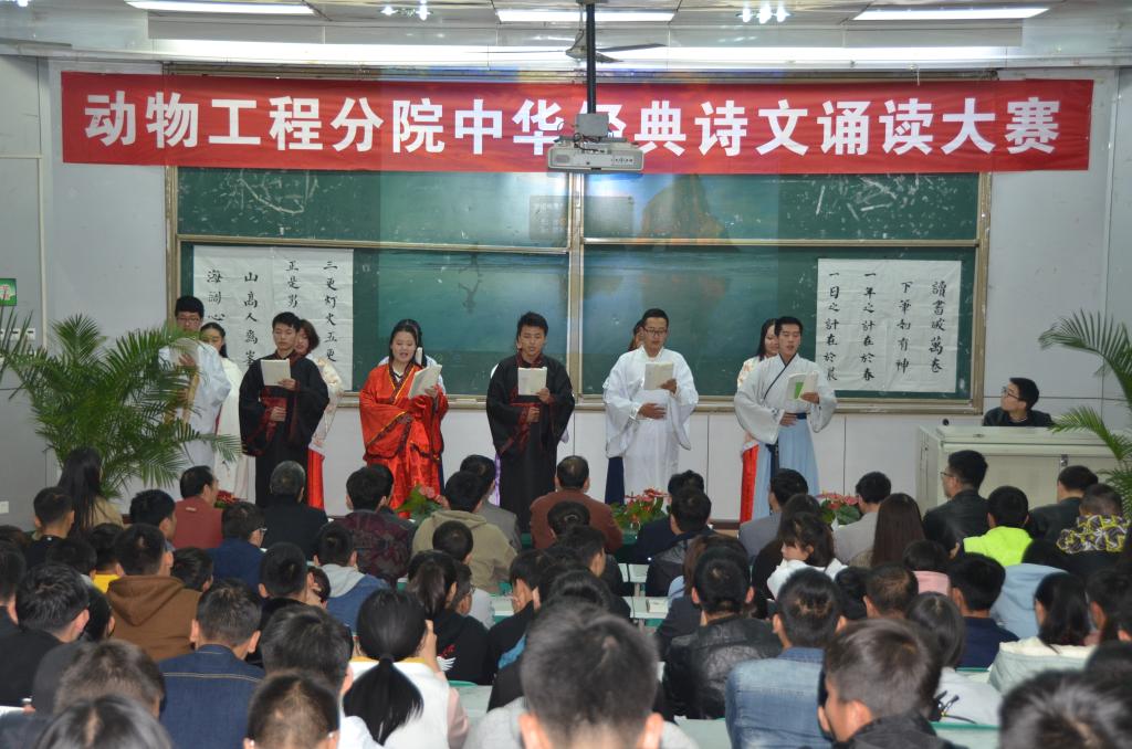 为了进一步推进“中华经典晨读”活动开展, 11月8日,动物工程分院中华经典诗文诵读大赛在北校区北台阶教室举行。院学工部、学生处、团委、动物工程分院主要负责人,以及辅导员、班主任、学生300余人观看了比赛。