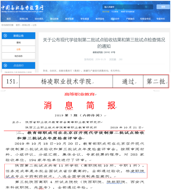 近日,教育部职业教育与成人教育司发布《关于公布现代学徒制第二批试点验收结果和第三批试点检查情况的通知》(教职成司函〔2019〕97号)公告信息,我院承担的教育部第二批学徒制试点项目(中药制药技术专业学徒制试点)通过终期验收提交的学徒制试点典型案例《“三阶四岗五保障”协同育人,聚焦生产一线高素质技术技能人才培养》成功入选全国学徒制试点典型案例(陕西省试点院校唯一入选案例)。
