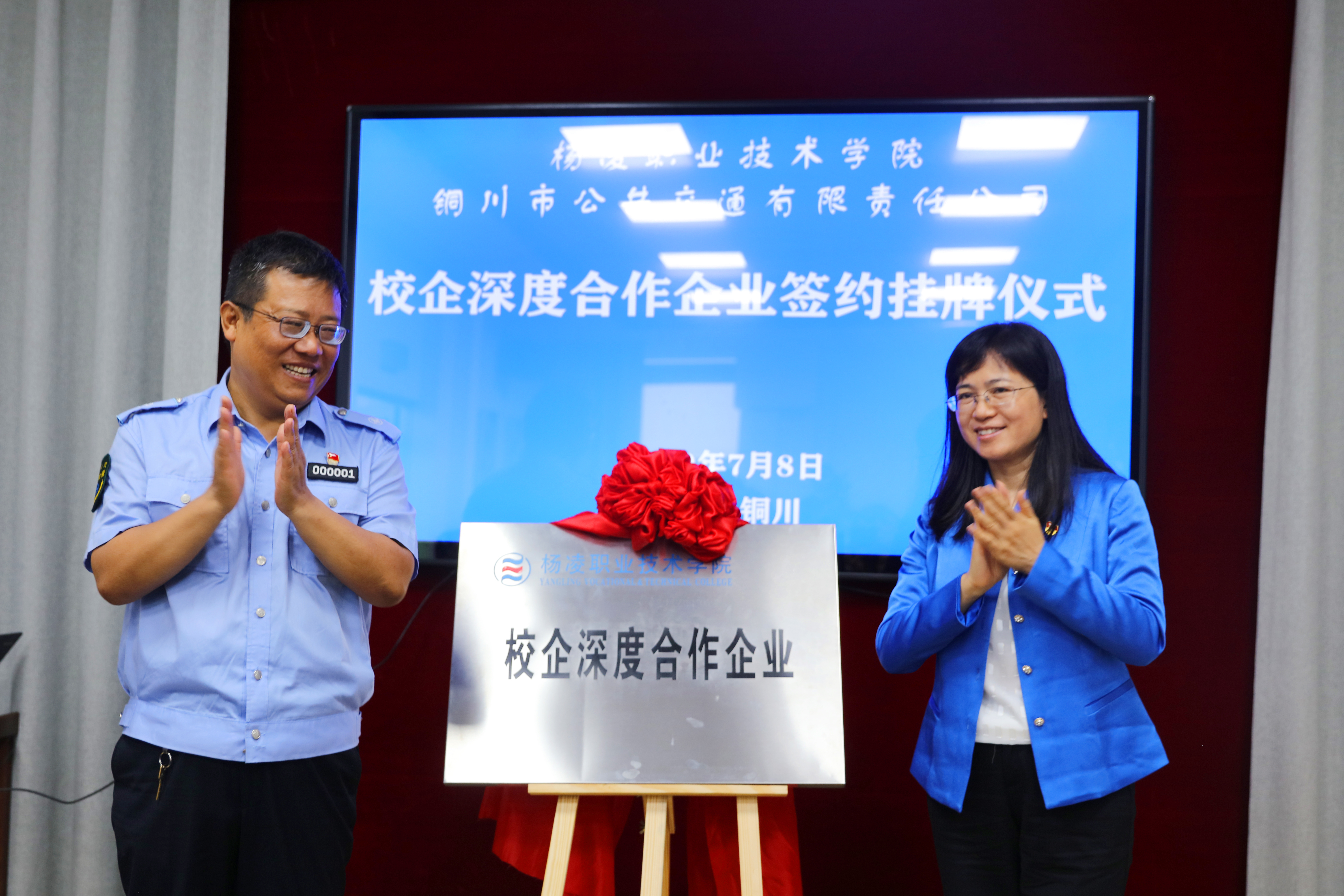 学院党委书记陈宁和铜川市公共交通有限责任公司党委书记、董事长司宝君共同为“杨凌职业技术学院校企深度合作企业”揭牌