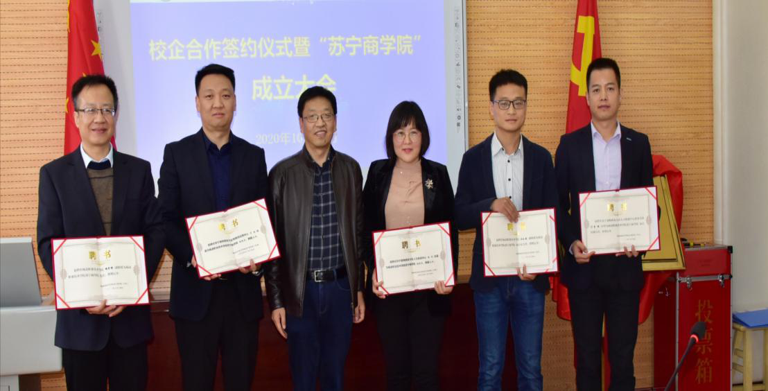 会上,刘粉莲与程峰共同为“苏宁商学院”揭牌,向程峰颁发客座教授聘书。拜存有宣布了“苏宁商学院”领导班子成员名单和主要职责。校企双方签订了《苏宁商学院合作协议书》。我校向苏宁易购集团授予“实践教学基地”和“师资培养基地”牌匾。苏宁易购集团授予我校“苏宁易购人才培养基地”和“苏宁易购员工培训基地”牌匾。肖强代表苏宁易购向学校捐赠10台电脑,设立苏宁奖学金。