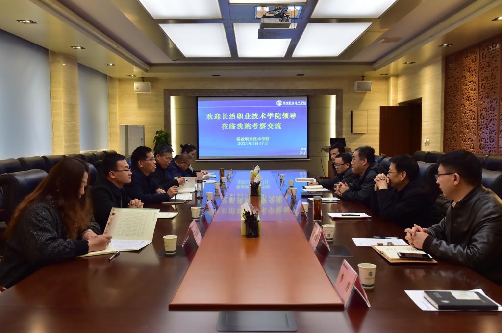 会上,张宏辉简要介绍了学校历史和发展现状,并就学校在“双高”建设、教学资源库建设、生态农业、人才培养、区校融合、国际合作、社会服务、管理改革等方面取得的经验。张吉虎介绍了长治职业技术学院的办学经历、人才队伍建设、产教融合等情况。双方均表示,今后要在多方面进一步加强交流学习。随后,双方针对相关问题进行了深入探讨。
