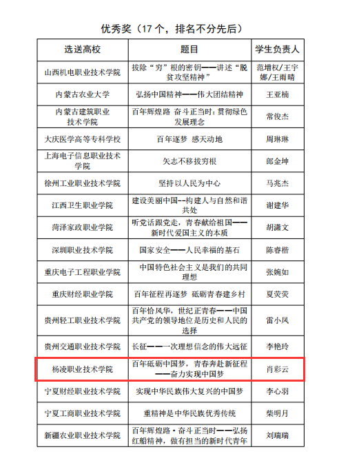 近日,教育部高校思政课教学指导委员会公布第五届全国高校大学生讲思政课公开课展示活动获奖名单。我校选送作品《百年砥砺中国梦,青春奔赴新征程——奋力实现中国梦》(学生负责人:肖彩云,指导老师:刘晓瑞)获优秀奖,为全省唯一获奖高职院校。