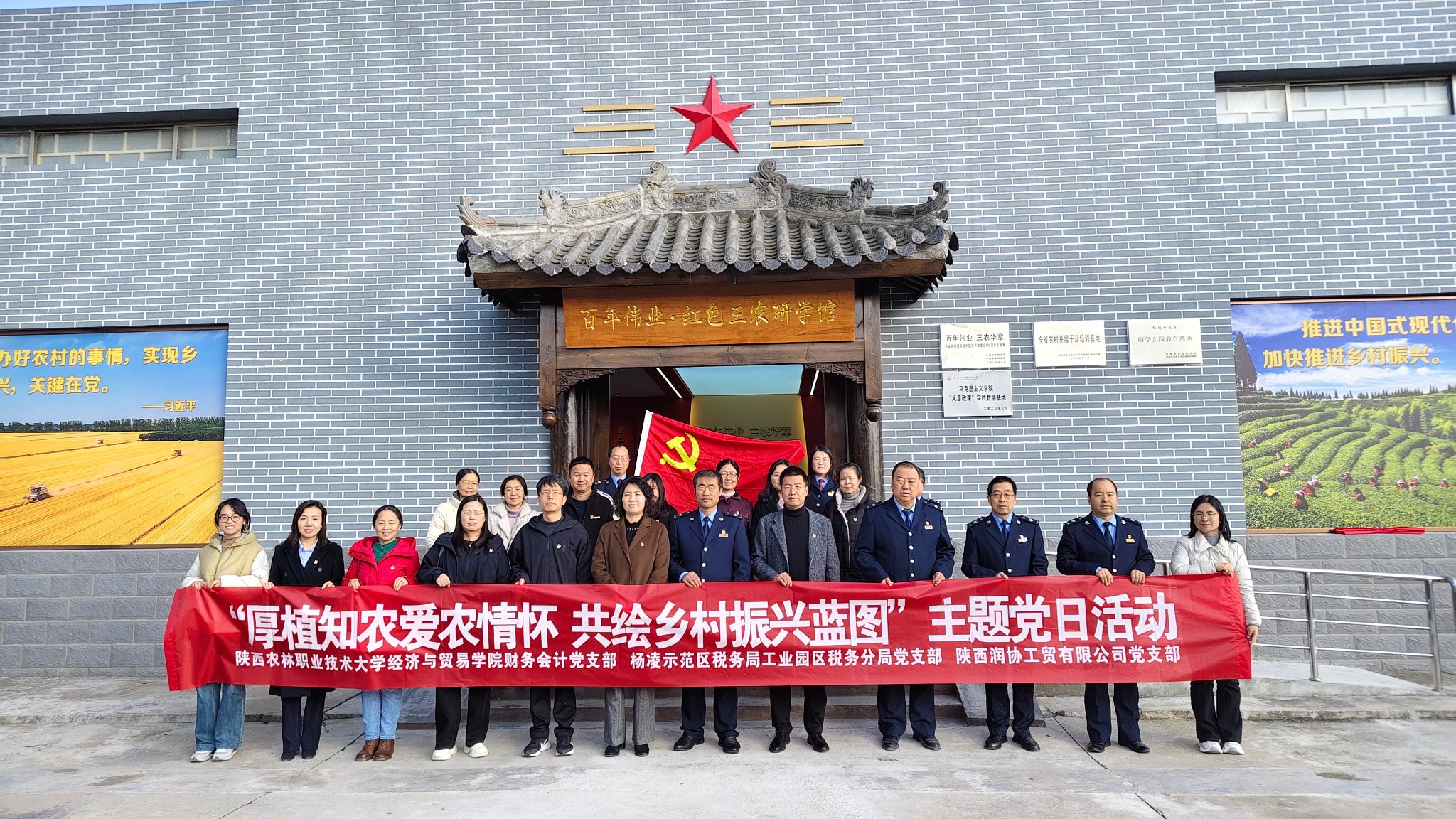 11月17日下午,经济与贸易学院财务会计党支部、杨凌示范区税务局工业园区税务分局党支部、陕西润协工贸有限公司党支部联合开展“厚植知农爱农情怀,共绘乡村振兴蓝图”主题党日活动。20余名党员共同参与,通过实地参观与交流研讨相结合的形式,共悟初心使命、共话责任担当,共谋兴农新篇。